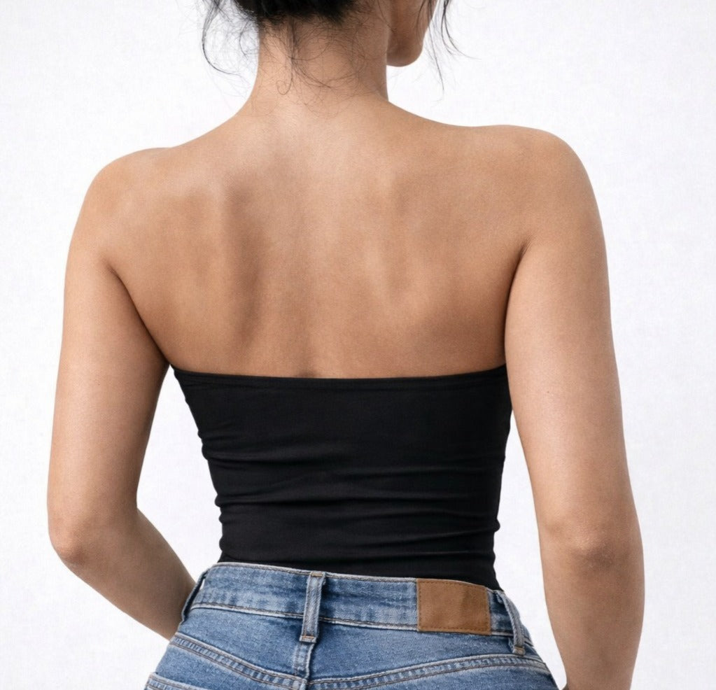 Top strapless en negro profundo con frunce central y cortes definidos que realzan la silueta con audacia. Sensual y firme.
