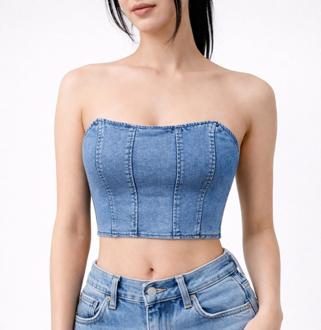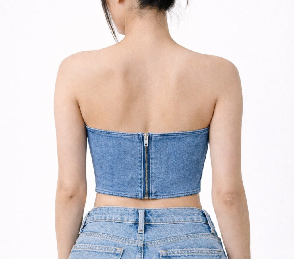 Corset strapless en denim azul con estructura que define la silueta y aporta presencia natural. Firme y elegante, una confianza que se sostiene