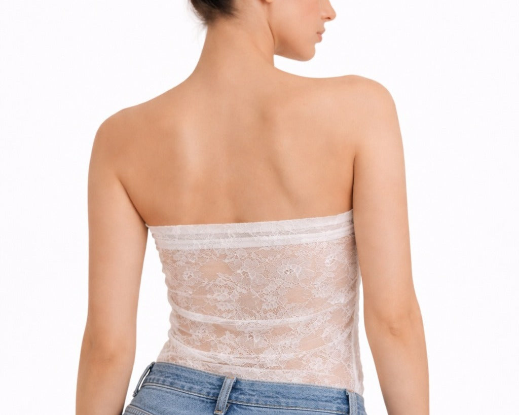 Top strapless en encaje blanco con caída asimétrica que aporta contraste dentro de la colección. Delicado y luminoso, un toque de brillo que rompe la oscuridad.
